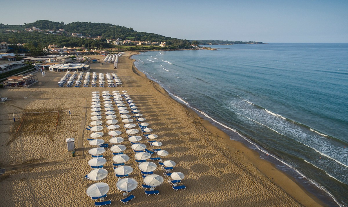 Awarded the Blue Flag for its crystal-clear waters and golden sands, the beach stretches for 1.2 km, offering rolling dunes and breathtaking sunsets over the Ionian Sea.