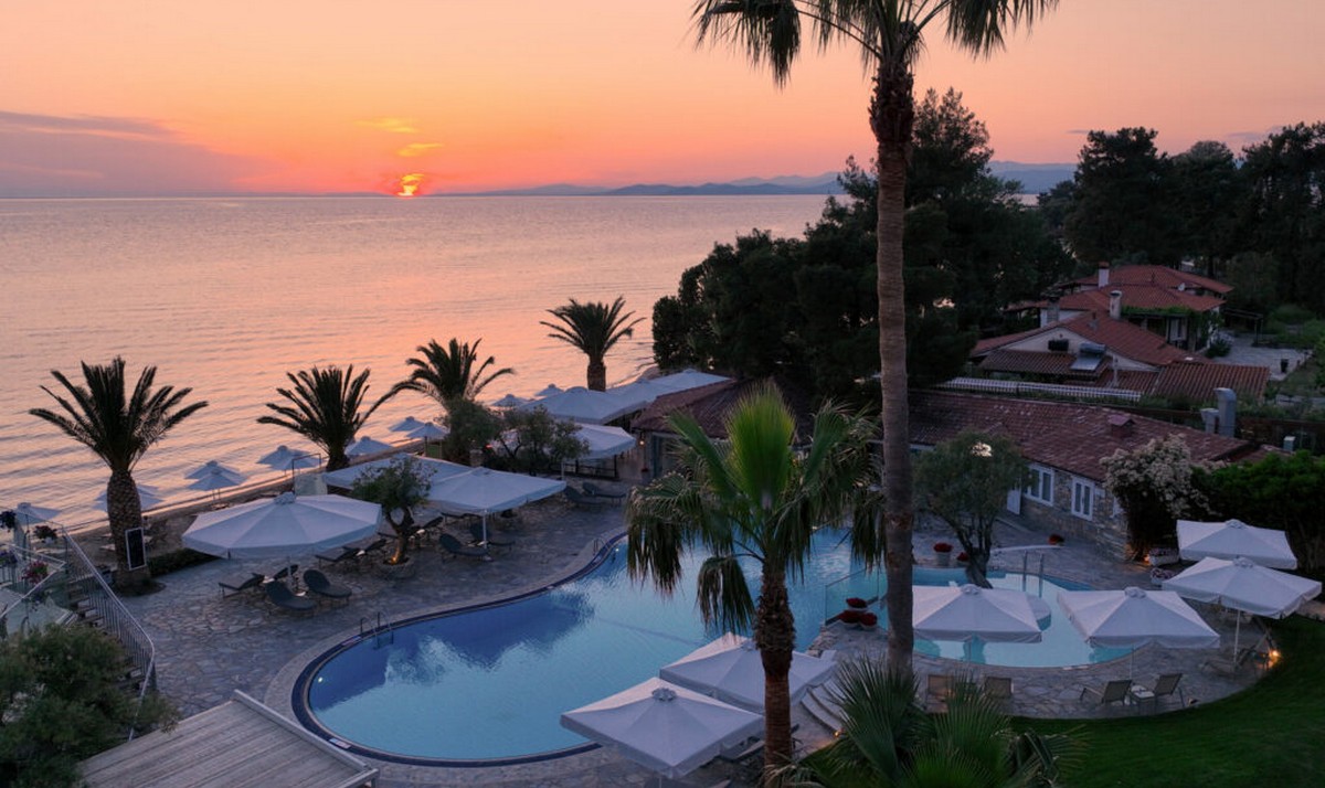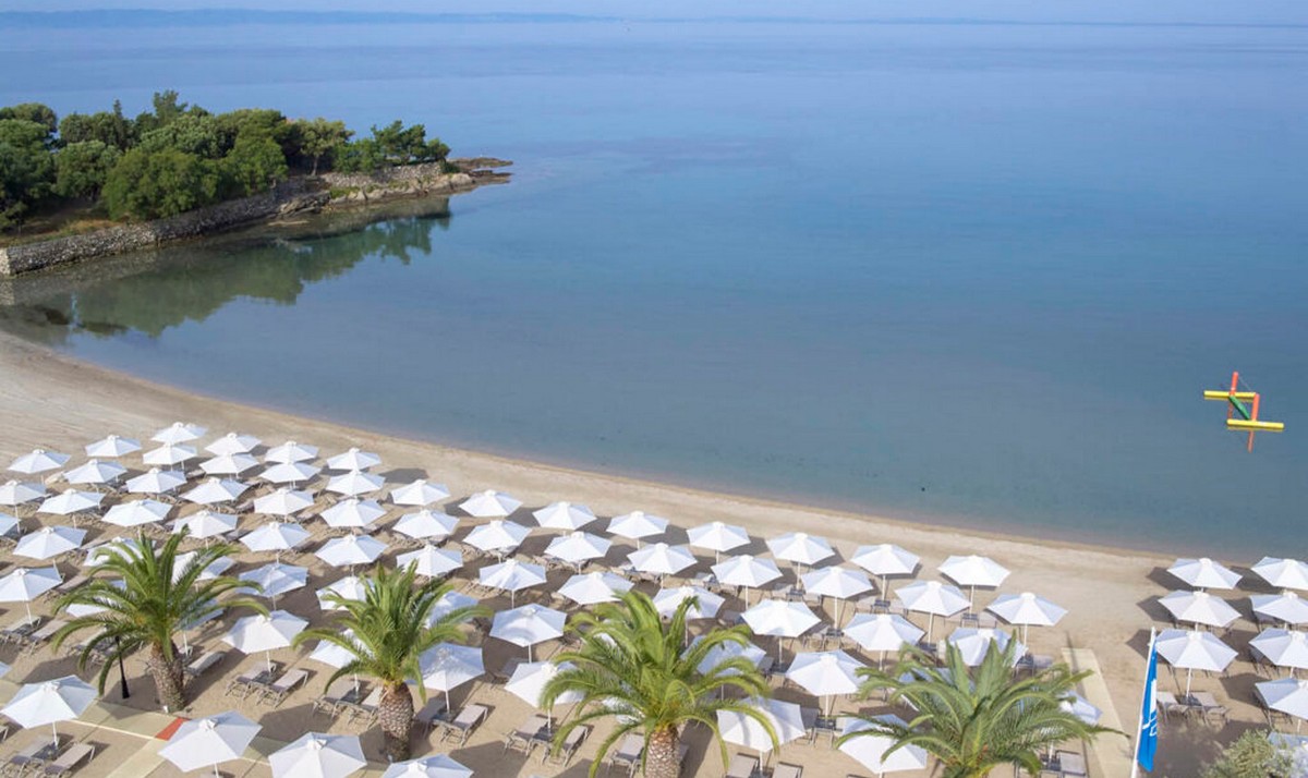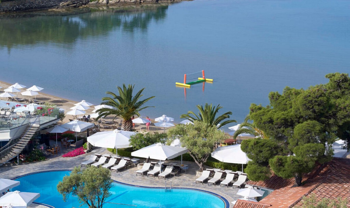Serving buffet-style breakfast (07:30–10:30) and dinner (19:00–22:00), this restaurant features Greek and international cuisine with daily show-cooking. A panoramic glass wall allows guests to observe chefs preparing meals. The “Dine Around” program enables half-board guests to exchange their dinner for a discounted à la carte meal at the “Yialos” Tavern (beverages excluded, reservations required).