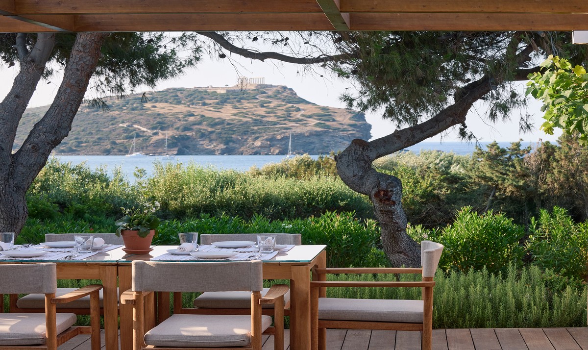 The Restaurant, located on the rooftop terrace of the main building, presents heartfelt Gastronomy with a unique view overlooking the wonderfully floodlit Temple of Poseidon.