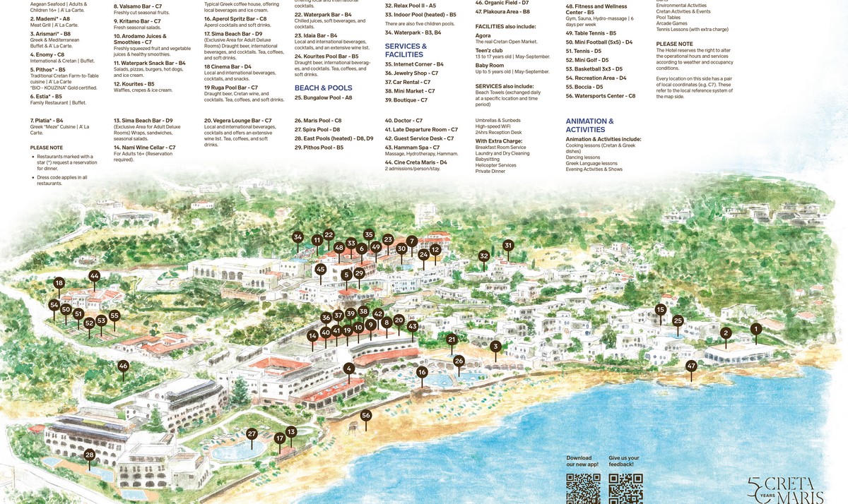 - Seven restaurants present a range of dining settings, from a seaside tavern to outdoor tables beside a Byzantine chapel, reflecting the flavours of Crete and the Mediterranean. The wine cellar introduces both Cretan and international labels from established wine regions, supported by thoughtfully composed wine lists. Six all-day snack points provide poolside refreshments, while nine bars offer a varied atmosphere from afternoon drinks to late evening selections.