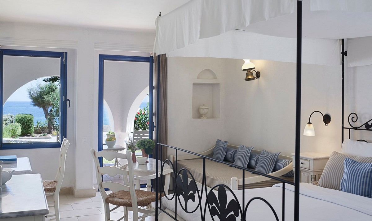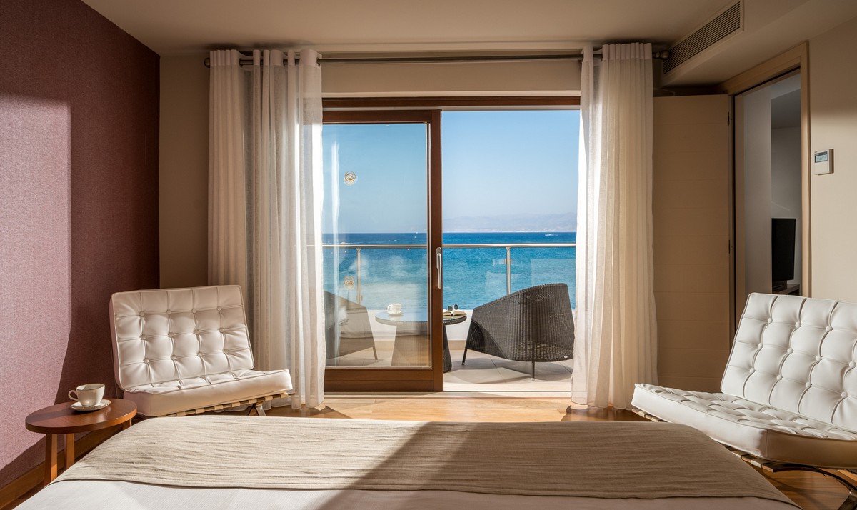- Situated across the Maris and Terra buildings and the Bungalows area, these rooms are oriented towards the Aegean, with uninterrupted sea views shaping the overall ambience. The 27–30 sq.m layout is open-plan, combining a bedroom and sitting area with either a king-size bed or twin beds, alongside a sofa bed tailored to occupancy.